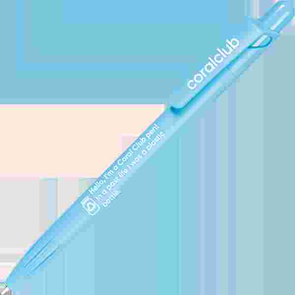Ballpoint pen with push-button mechanism made of PET-RECYCLED material with the inscription "Hello, I'm a Coral Club pen! In a past life I was a plastic can."
